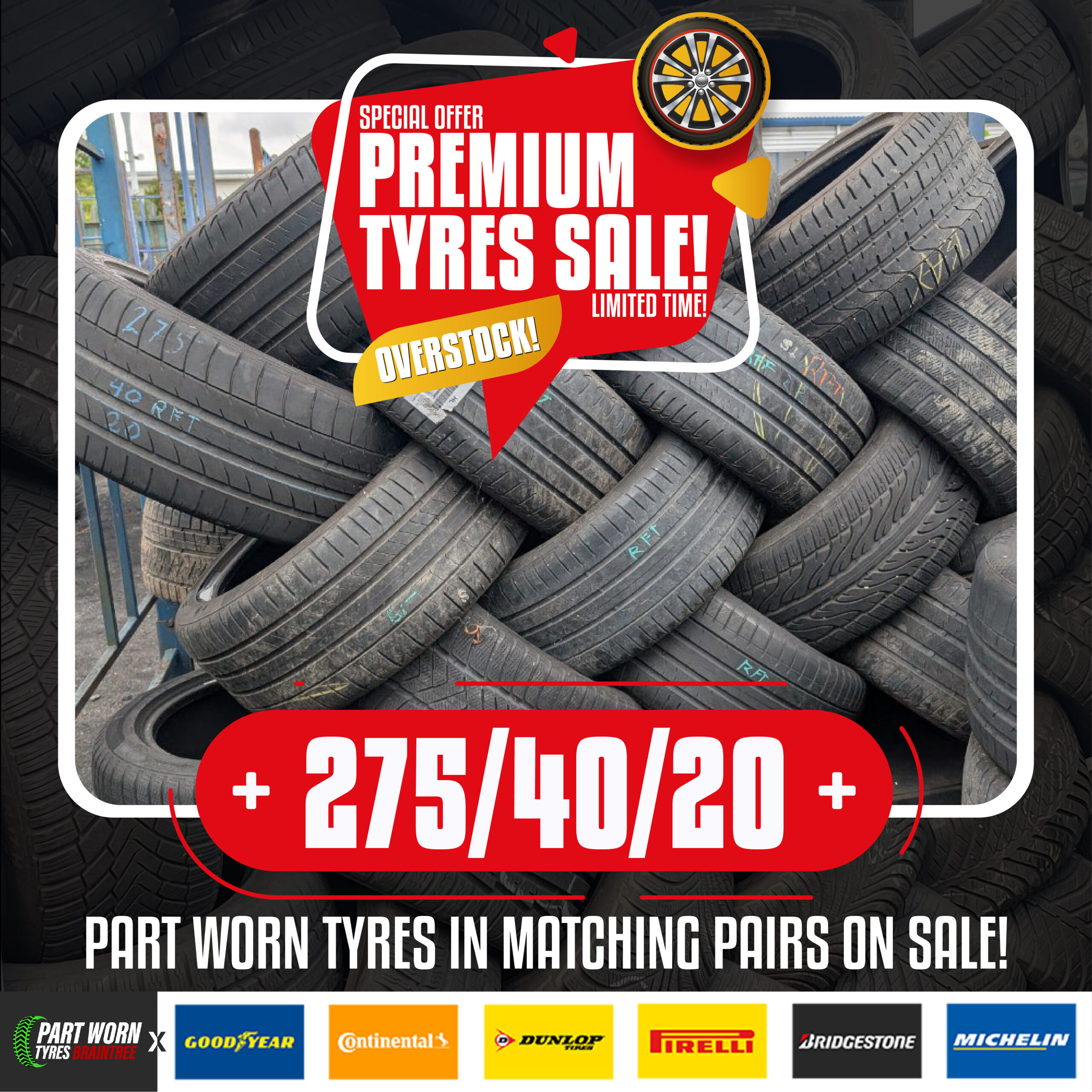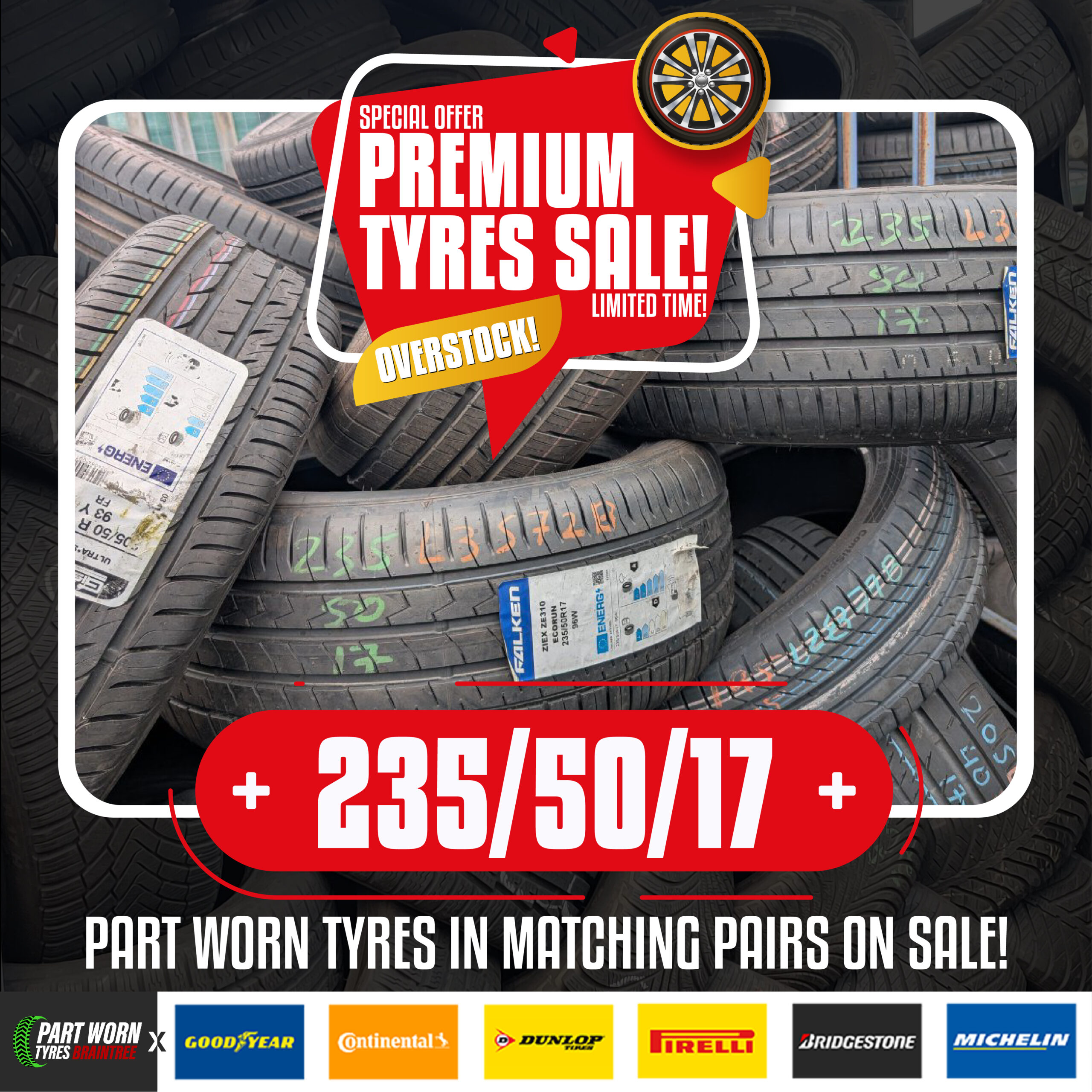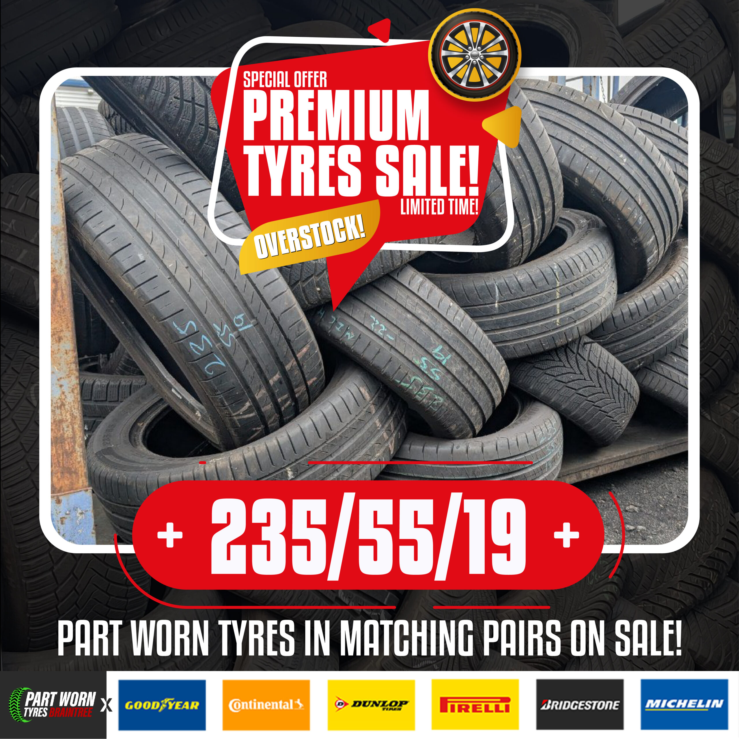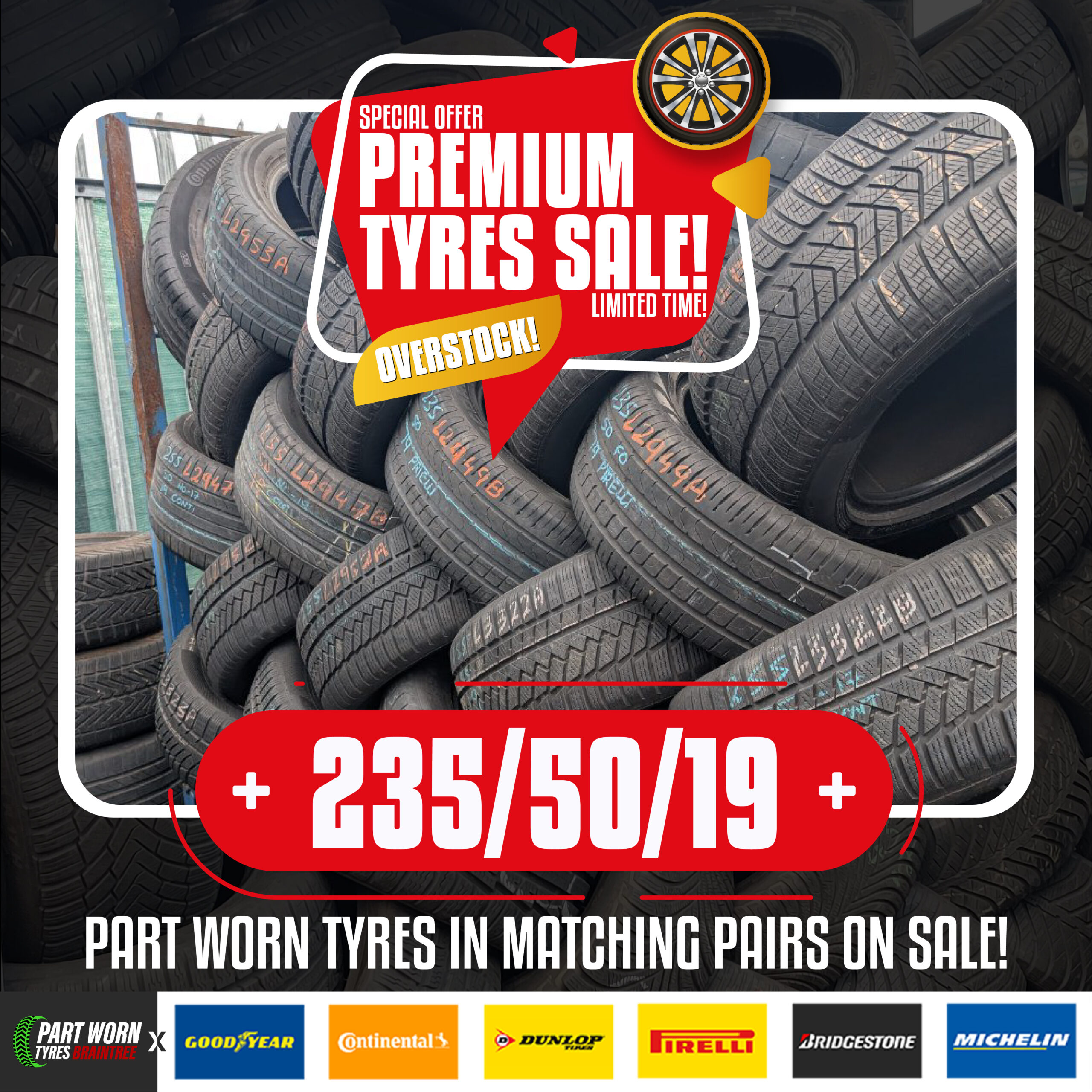 Promotional materials for social media campaign on Overstock of various sizes of Part Worn Tyres that are currently on sale.